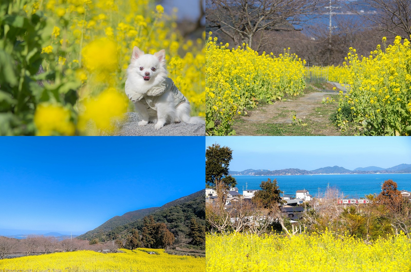 菜の花の中を歩ける小道もあり、犬との2ショット撮影にもぴったり。のんびり歩くにはちょうどいい広さですよ。
